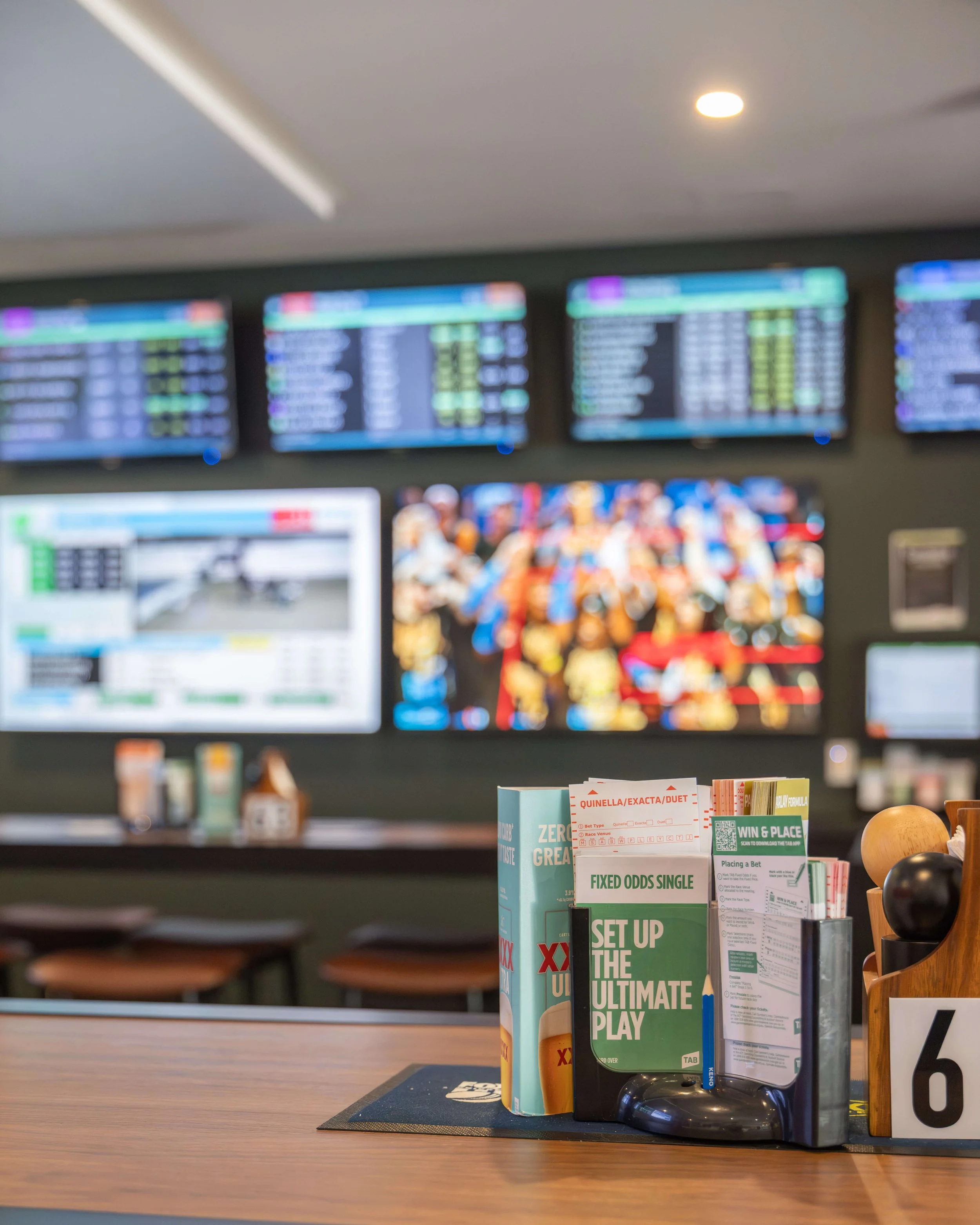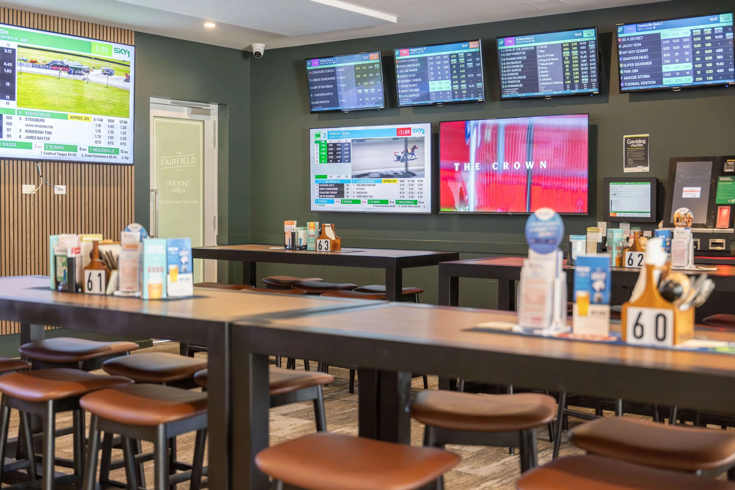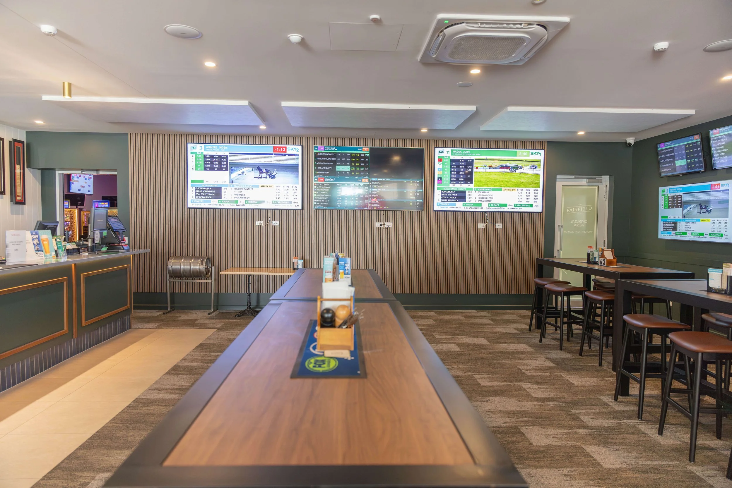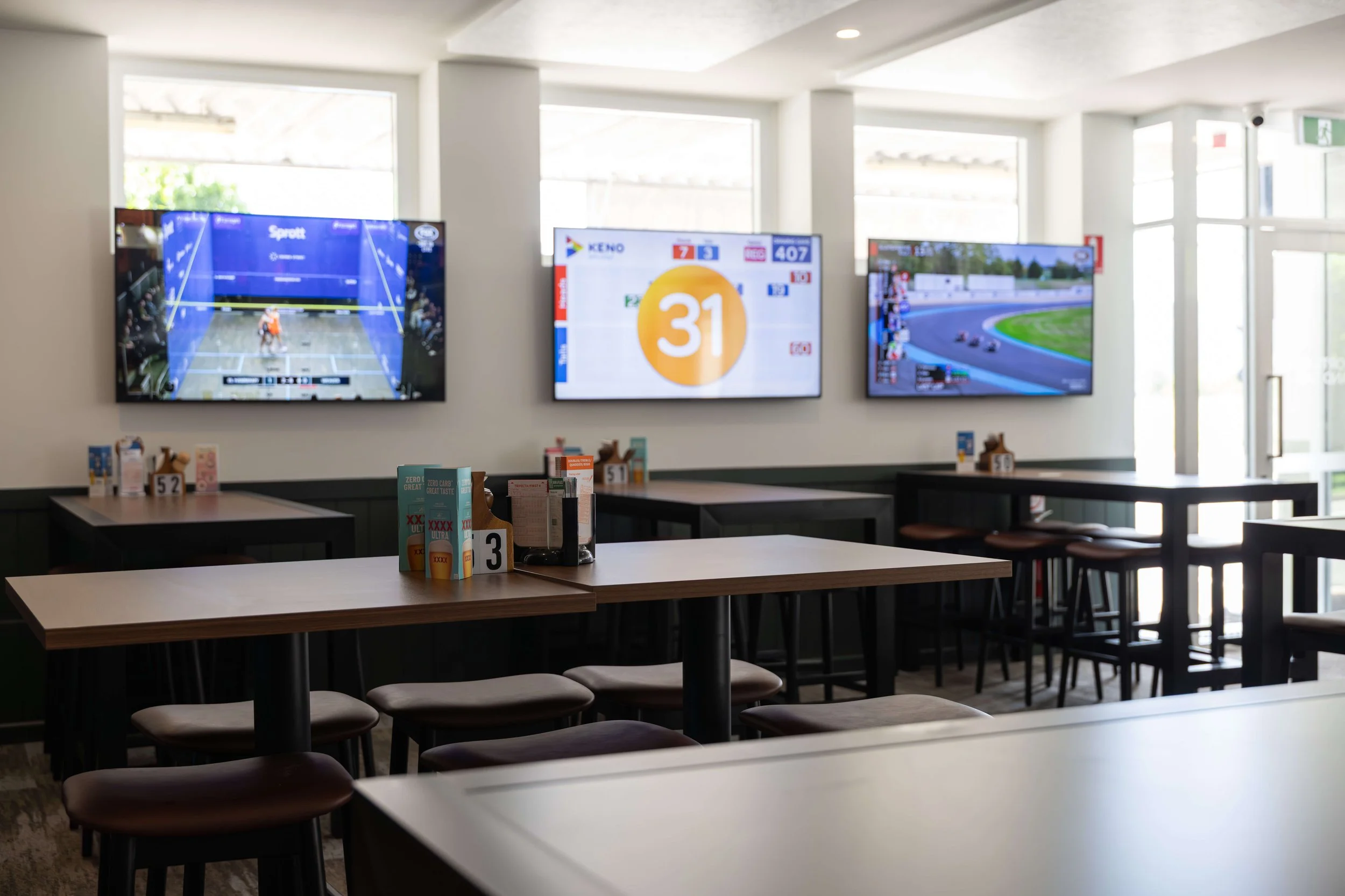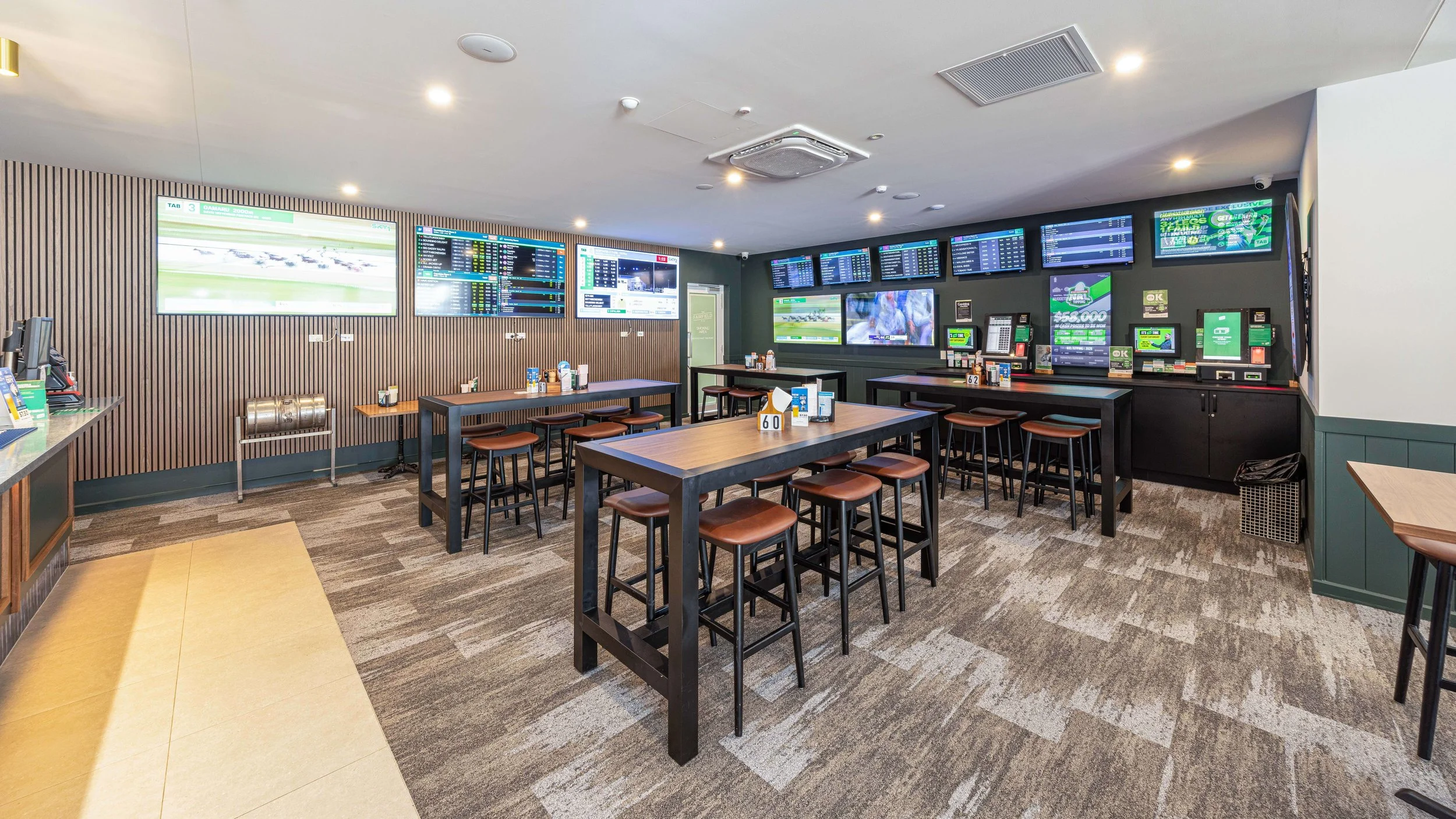 Our TAB area ensures clear sightlines from every position, with SKY Racing 1 & 2 and odds screens visible throughout. Featuring multiple large screens including three 85-inch displays and additional 65-inch and 55-inch screens, the space delivers comprehensive coverage of live racing, upcoming odds and results.